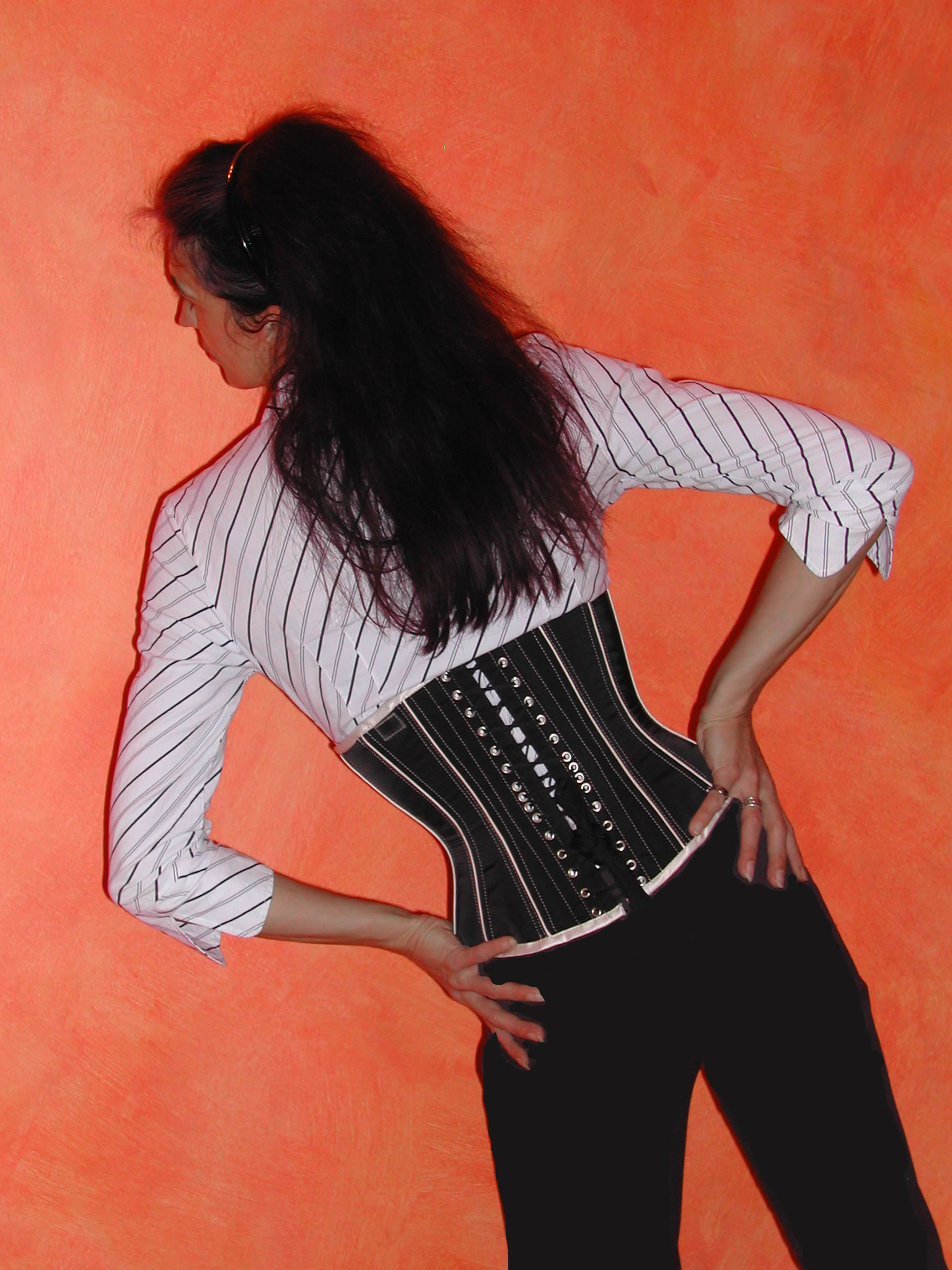 Rückansicht: Satin schwarz mit créme-farbigen Paspeln, Einfassungen und Nähte