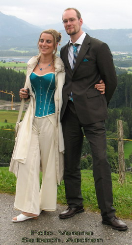 Beschreibung: ein Überbrustmodell (Hurrikan) in Satin türkisblau mit crèmefarbenen Paspeln + Einfassung