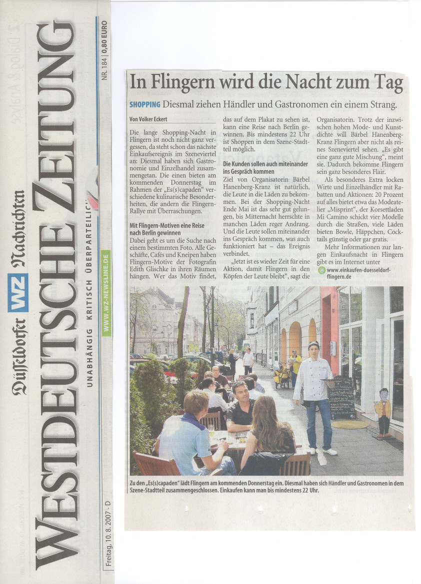 zur Event-Übersicht 2,5 Jahre gibt es nun das "mi camino" und kein Neon-Werbeschild o.ä. prankte an der Häuserfront der Dorotheenstr., die gottseidank noch einige Häuser vom Anfang des 20. Jahrhundert vorzuweisen hat. Dies war auch so ziemlich der Anfang unseres Auslegers: wir wollten kein übliches Leuchtreklameschild sondern etwas, das zu "mi camino" und zu dem Stil des Hauses paßt. Ein dickes Dankeschön an dieser Stelle an den Eisenkünstler Ingo Lüder (www.eiserne-kunst.de), der einen Korsettschnitt aus dieser Zeit super in ein Eisenkorsettschnitt umgewandelt und für uns realisiert hat (auch ein dickes Dankeschön an seine Maja von FrouFrou Design, die immer noch auf Ihren Ausleger warten muß!). Nachfolgend ein paar pics, wie die Dame des Hauses selbst Hand anlegt und die Herren der Schöpfung (auch hier ein dickes DANKE an Sascha und seine Katrin, die uns beim Anbringen super geholfen haben!) gespannt und skeptisch auf die Resultate wartet und schaut ;-) Zum guten Schluß wurde auch mit einem Schluck obligatorischen Glühwein angestoßen! Einen Bericht hierüber findet Ihr auch unter: www.einkaufen-duesseldorf-flingern.de :