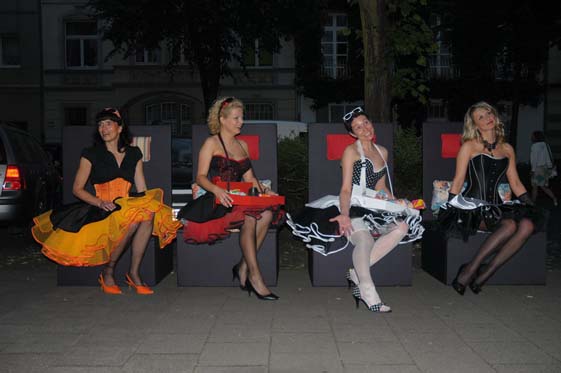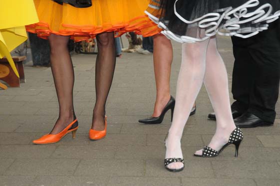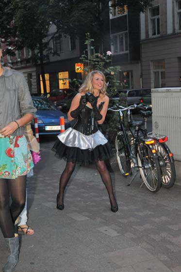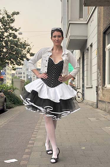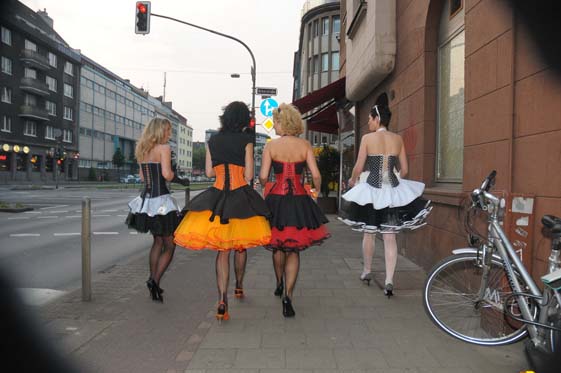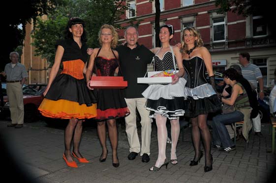 Als Special hatten wir uns die Rockabilly-Zeit ausgesucht und im Vorfeld fleißig Petticoats und Tellerröcke genäht, so daß 4 super ausssehende Rockabellas im Korsett mit echten (Naht-) Nylons auf den Straßen von Flingern bewundert wurden. Unser kleines Lädchen wurde auch in diesem Jahr wieder von vielen Neugierigen & Interessierten aufgesucht, die sich über Korsetts informieren und auch einmal selbst ausprobieren wollten wie man sich in einem Korsett fühlt, um ganz erstaunt festzustellen: so ein Korsett ist ja doch bequem, man fühlt sich gehalten und gestützt! Einige haben das Angebot genutzt und sich im Korsett von Fotograf Christian Ritter (www.koerper-linien.de) fotografieren zu lassen.